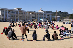その後校庭で,6年生が1〜5年生の各学級に入ってハンカチ落としゲームと○×ゲームのレクリエーションをしました。