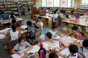 図書室では,きょうだいや近所の友だち同士誘い合って,クーラーの効いた涼しい部屋で夏休みの課題帳に取り組んだり,本を読んだりして過ごしています。